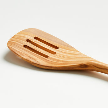 El inconfundible veteado de la madera de olivo envuelve una impresionante y robusta cuchara ranurada. Ideal para sacar verduras del agua hirviendo, esta resistente cuchara también levanta albóndigas al vapor, cocina huevos escalfados y sirve fruta macerada. Como parte de nuestra colección de utensilios de madera de olivo Moreno, cada pieza se distingue por su veteado único y su cálido color orgánico. Reúnalos todos en uno de nuestros portautensilios. Nuestra cuchara ranurada de madera de olivo es una exclusiva de Crate and Barrel .
