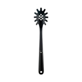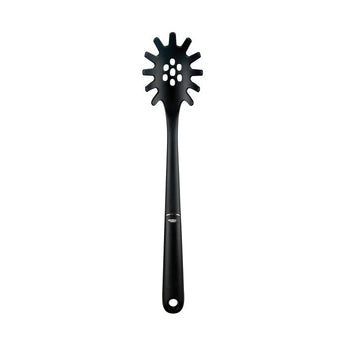 El utensilio de cocina esencial, en nylon resistente al calor y seguro para cualquier vajilla, para cocinar sin preocupaciones. Esta cuchara para pasta cuenta con un mango delgado y antideslizante de Santoprene con un moderno acento de zinc chrome y orificio para colgar. La cuchara negra luce elegante y contemporánea acorralada en un portautensilios sobre la encimera de su cocina. Nylon con mango de Santoprene®. Logo/anillo de zinc Chrome . Resistente al calor hasta 400 grados. Apto para lavavajillas