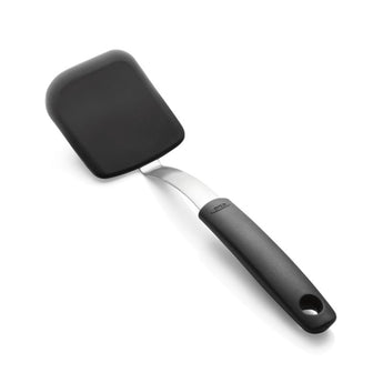 La espátula gris para galletas de OXO tiene un borde fino y flexible que se desliza fácilmente bajo las galletas y otros productos horneados, mientras que el mango angular antideslizante mantiene las manos alejadas de los platos calientes.