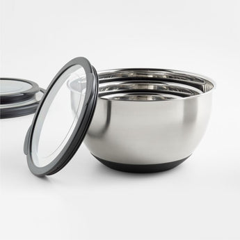 Atemporales y multiusos en la cocina, nuestros boles de acero inoxidable equilibran forma y funcionalidad. El acabado cepillado de los boles pulidos a mano evita las huellas dactilares, mientras que las bases de silicona negra mantienen los boles en su sitio mientras usted trabaja. Perfiladas en silicona a juego para un cierre hermético, las tapas clear facilitan ver lo que hay dentro. Los tres cuencos mezclan, marinan, almacenan y sirven, luego se limpian fácilmente en el lavavajillas y se encajan para un almacenamiento compacto.
