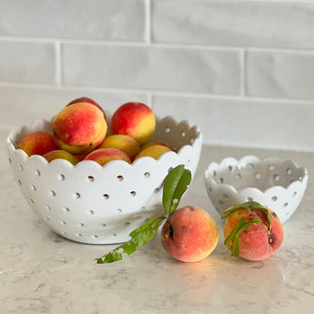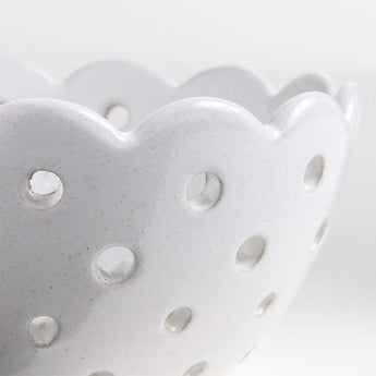 Inspirada en sus vestidos de verano favoritos, Laura Kim diseñó este encantador escurridor con un estampado de ojales y un romántico borde festoneado. Las perforaciones decorativas hacen las veces de orificios de drenaje, por lo que este pequeño escurridor de cerámica esmaltada en blanco es ideal para enjuagar los productos frescos del huerto, la tienda o el mercado agrícola. Nos encanta especialmente apilarlo con bayas para darle un toque caprichoso a la mesa del brunch.