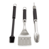 - Dé la vuelta a las hamburguesas, voltee las verduras o glasee sus costillas con sabor extra. La espátula de 3 lados con borde biselado, las pinzas de bloqueo manos libres y el pincel hilvanador de silicona de tamaño completo del juego de parrilla Precision de 3 piezas son sus utensilios esenciales para asar a diario en un solo kit. Todos los utensilios tienen un mango suave al tacto para un agarre cómodo y seguro