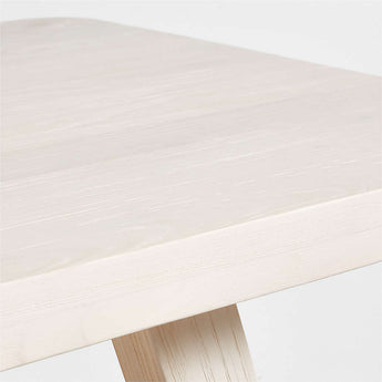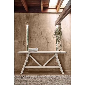 Las modernas líneas arquitectónicas atenuadas por el acabado pintado al lavado hacen que esta consola de pino macizo combine con cualquier estilo. Los ángulos, las inclinaciones y los bordes rectos atraen la mirada hacia la base de caballete, mientras que la sencilla tapa de tablones recuerda el aspecto desgastado de una mesa de granja. La cálida mesa de madera blanca ilumina una habitación y desarrollará su propio carácter vivido y su rica pátina con el paso del tiempo.