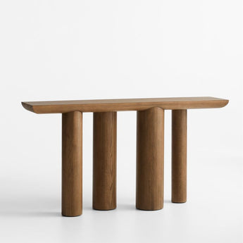 Como una pieza de escultura moderna, nuestra mesa consola Bomen hace una audaz declaración de forma y proporción equilibradas. Las relaciones matemáticas son la clave de su llamativo diseño, que presenta patas redondas que aumentan cada vez más de diámetro. Pensadas para ser experimentadas desde distintos ángulos, las patas de la mesa están escalonadas cuando se miran de frente, pero son perfectamente paralelas cuando se ven de perfil. La mesa asimétrica está hecha de roble macizo y chapa de roble con un cálido acabado marrón cebada para avivar el veteado. La consola de roble Bomen, una exclusiva de Crate & Barrel, se convertirá en el centro de atención de su salón o entrada.