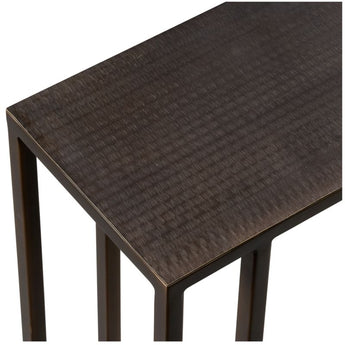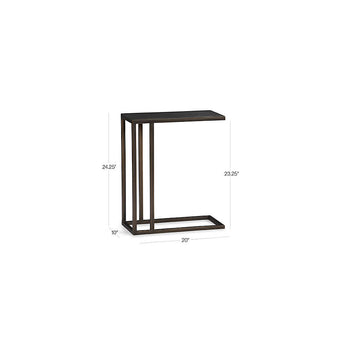 Forma y funcionalidad convergen en una ingeniosa mesa en forma de "C" que oculta una superficie aerodinámica sobre el sofá, el sillón o la tumbona. El armazón lineal abierto de hierro bronceado se levanta cuando y donde lo necesite, ofreciendo un práctico lugar junto al brazo para los tentempiés y la informática. ^ Elegante en su diseño e intrincado en sus detalles, el tablero acabado en bronce de la mesa C está grabado a mano con un fino dibujo estriado y tiene un acabado bruñido con una capa de pintura en polvo de color bronce oscuro y matices dorados. La mesa Echelon C es una exclusiva Crate and Barrel .