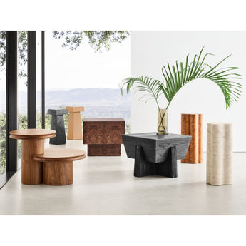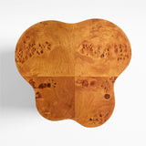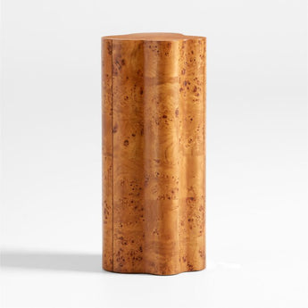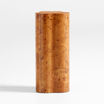 Las curvas orgánicas de la chapa de madera burl aportan calidez y vitalidad a nuestra moderna y monolítica mesa auxiliar. El patrón natural de las vetas arremolinadas de la madera luce maravillosamente en las curvas onduladas de la mesa auxiliar. Alta y columnar, la mesa se eleva a la altura justa para sostener una bebida junto a una silla o un sofá. Un verdadero tema de conversación, la mesa de madera de burl Fleur es una exclusiva de Crate & Barrel.
