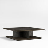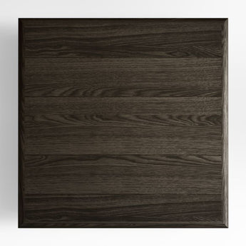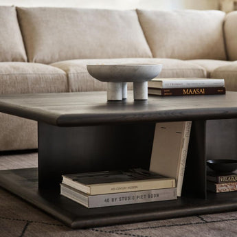 Preto cautiva con líneas fuertes y una fresca mezcla de materiales. Haciendo hincapié en la horizontalidad, dos grandes cuadrados de fresno ebonizado forman el tablero y la base de plataforma de la mesa de centro, con bordes almohadillados que añaden un toque de suavidad al diseño lineal. Intercalada entre la madera, una base de pedestal hecha de planos entrecruzados de acero ennegrecido define la estética moderna e industrial de la mesa.