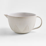 Un bosque nevado de hojas perennes minimalistas rodea nuestro invernal bol para rebozar Árboles Blancos. Inspirado en la cerámica artesanal, el bol de gres está acabado en un blanco roto sutilmente moteado. El esmalte mate del exterior tiene un aspecto moderno, mientras que el esmalte brillante del interior resiste los batidores y cucharas de metal. Los árboles tallados permiten que el esmalte se acumule, creando un encantador aspecto cargado de nieve. Con un encantador asa y pico vertedor, el cuenco para rebozar es especialmente perfecto para hacer gofres o tortitas en la mañana de Navidad.