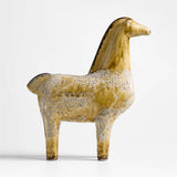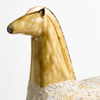 Estamos enamorados de esta majestuosa y a la vez encantadora escultura de caballo. Los esmaltes reactivos en marrón oscuro y tonos amarillos cubren el equino de barro, mientras que la textura aplicada a mano enriquece su aspecto orgánico. Nuestra gran escultura de Rouen luce regia por sí sola o expuesta con su homóloga más pequeña en una estantería, repisa de chimenea o aparador. Debido a los esmaltes reactivos y a las técnicas artesanales, cada caballo es único.