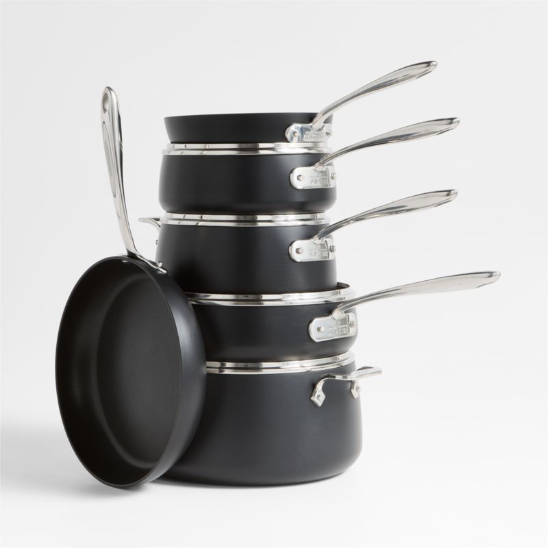 Cocine como un experto. Anodizado para absorber, distribuir y transferir el calor de manera uniforme y eficiente, este juego de utensilios de cocina de 10 piezas fríe, guisa, hierve y saltea a la perfección. Las sartenes de aluminio de calentamiento rápido cuentan con bases de acero inoxidable que resisten la deformación y calientan de manera uniforme. Las cómodas asas de acero inoxidable proporcionan un agarre firme mientras revuelve y voltea, mientras que las Cristal sellan el calor y la humedad. Tres capas de acabado antiadherente duradero garantizan una fácil liberación y una rápida limpieza en el lavavajillas. Este versátil juego incluye sartenes de 8 y 10 pulgadas, cacerolas de 2,5 y 3,5 cuartos de galón con tapas, sartén de 4 cuartos de galón con tapa y olla de 8 cuartos de galón con tapa.