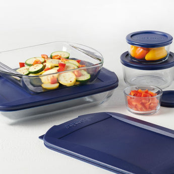 Hornear, guardar, recalentar y repetir. Este versátil juego de almacenamiento va del horno al congelador, al microondas y al lavavajillas, lo que facilita la cocción por lotes y mantiene las sobras listas para la comida del día siguiente. Cubiertos con tapas azul marino resistentes al horno, los recipientes Cristal templados sirven para hornear de todo, desde lasaña hasta brownies o tartas individuales. El Cristal no se deforma, no se mancha ni retiene olores, y los platos se encajan para un almacenamiento compacto. Este juego de 10 piezas, un práctico regalo de inauguración, incluye un molde de 3 cuartos con tapa, un molde cuadrado de 8 pulgadas con tapa y recipientes de 1, 2 y 4 tazas con tapa.