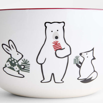 Abrigados y listos para las fiestas, los encantadores amigos árticos de Joan Anderson posan sobre el fondo blanco como la nieve de nuestros tazones invernales. Los animales están ilustrados con limpias líneas negras adornadas con festivos estallidos de color: bufandas (y narices) rojas para los renos, un jersey Fair Isle verde en el conejito, y regalos navideños a rayas rojas y verdes presentados por el oso polar y el zorro. Los bordes rojos pintados a mano detallan los cuencos pequeño y grande, mientras que las rayas de bastón de caramelo adornan el cuenco mediano. Este juego es perfecto para mezclar masa para tartas, crema de mantequilla y ganache o para presentar un trío de aperitivos o ensaladas.