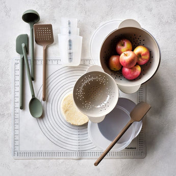 Este útil juego almacena seis elementos esenciales de cocina en una sola pila ordenada. Fabricados en melamina duradera en una paleta moderna y discreta, los cuencos y coladores de melamina duradera se encajan de forma compacta. Unos orificios cuidadosamente colocados garantizan que los dos coladores taupe escurran bien, mientras que las asas con lengüeta facilitan darles una sacudida. Útiles para mezclar, marinar, servir y almacenar, los dos cuencos blancos están rematados con tapas para mantener fresco el contenido. Este juego, que ahorra espacio, es un estupendo regalo de graduación o de inauguración de la casa.
