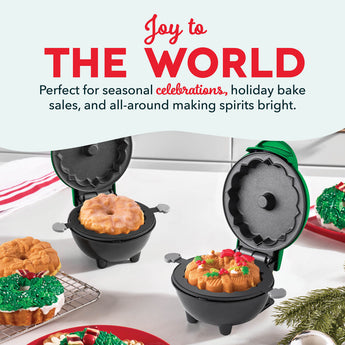 ¡Hágalo casero para las fiestas! Hornee divertidos y festivos mini bollos Bundt® de 4" con un distintivo diseño de corona directamente en su encimera, ideales para celebraciones estacionales, ventas navideñas de pasteles y para alegrar el espíritu en general. Las dos superficies de cocción antiadherentes desprenden los pasteles limpiamente, y la práctica herramienta de extracción levanta los pasteles cocinados fácilmente para conseguir siempre creaciones dignas de Instagram. Hornear en la encimera es seguro y divertido para los niños, a la vez que libera espacio en el horno para la gran comida: ¡los pasteles se cocinan en sólo 10 minutos! ¡A toda la familia le encantará hacer minis alegres y llevar un poco de alegría al mundo!