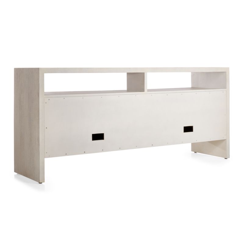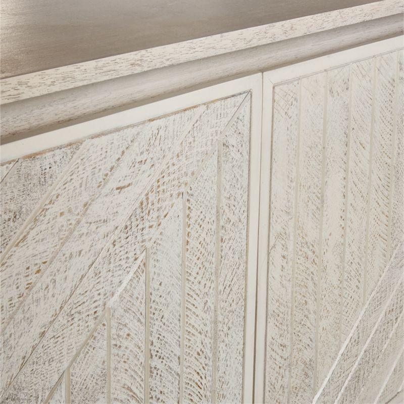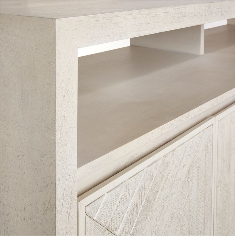 Empleando la técnica consagrada de la parquetería, hábiles ebanistas añaden rusticidad artesanal a nuestra limpia y contemporánea credenza Dunewood. Aportando complejidad geométrica a las puertas de frente plano de la credenza, cada pieza de madera de mango se corta cuidadosamente y se incrusta a mano para crear un moderno mosaico de líneas angulosas. Un lavado de blanco y un ligero apresto añaden un susurro de color y textura para realzar la escultural presencia de esta llamativa credenza. Diseñado por Blake Tovin de Tovin Design, el aparador cuenta con una balda abierta y dos baldas interiores.