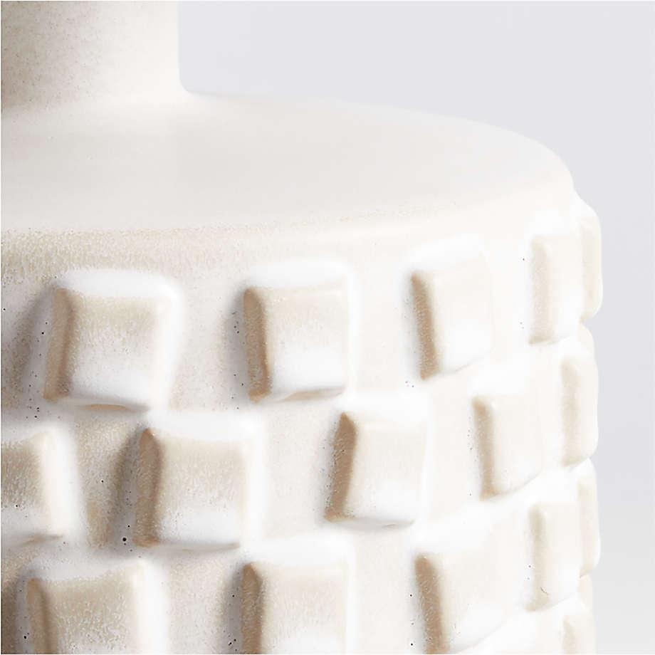 Unos cuadros encantadoramente desalineados texturizan nuestra lámpara de mesa Eino con un patrón orgánico y una sensación juguetona. Esmaltada en marfil translúcido, la base cilíndrica de cerámica descansa sobre un sutil pedestal y está rematada con una alta pantalla de lino que continúa el aspecto natural y artesanal. Nos encanta colocar nuestra exclusiva lámpara de cerámica Eino donde pueda admirarse su superficie única.