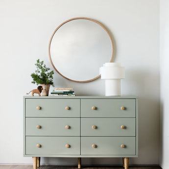 Con un fino borde de madera, nuestros espejos de pared Finn aportan un toque de diseño moderno y minimalista a la habitación de los bebés o los niños. El cálido acabado en roble de este espejo de líneas limpias y discretas combina a la perfección con nuestras diversas colecciones de muebles para dormitorios y habitaciones infantiles.