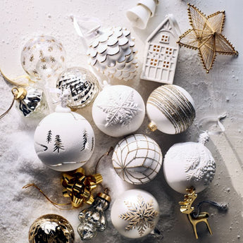 Purpurina plateada y dorada traza un entramado de encaje en este adorno de bola blanco mate. Soplada a mano por talentosos artesanos, la bola de red Cristal se pinta después a mano en un remolino de purpurina Cristal metálica. Nuestro brillante adorno para el árbol de Navidad plateado y dorado es una exclusiva de Crate & Barrel.