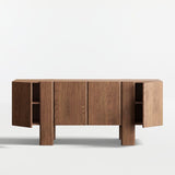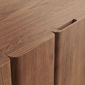 Mostrando una llamativa mezcla de patrones de veta catedral y recta, nuestro aparador Hearth saca el máximo partido a su construcción en roble con puertas de armario de frente plano y patas de tablón redondeado que se extienden hasta la parte superior para dejar entrever la veta final. Los tiradores de ranura abren los dos armarios laterales individuales y el central de doble puerta que se abren a un generoso espacio de almacenamiento con estantes ajustables. El cepillado de alambre y un acabado en marrón cálido añaden a la credenza un estilo fácil y accesible.