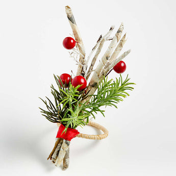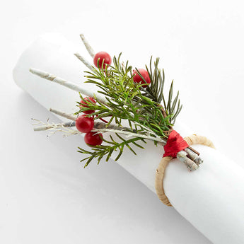 Los elementos botánicos de imitación rodean las servilletas con el aspecto de pino fresco y bayas rojas. Especialmente festivo con nuestras servilletas naturales, rojas o blancas, el servilletero proporciona el acento perfecto a la mesa de comedor de temática invernal o navideña.