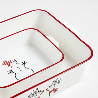 Vestidos y listos para las fiestas, los encantadores amigos árticos de Joan Anderson posan sobre el fondo blanco como la nieve de nuestros invernales platos para hornear. El muñeco de nieve y el reno están ilustrados con limpias líneas negras adornadas con festivos detalles rojos: un sombrero de copa para el muñeco de nieve y bufandas a rayas para el caribú. Acabados con bordes pintados a mano en rojo a juego, los dos horneros constituyen una encantadora presentación de crumble de arándanos, tubérculos asados o rollos de canela de la mañana de Navidad.