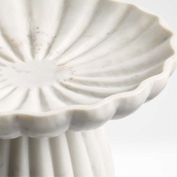 Nuestra colección Jolie ha sido diseñada con un aspecto clásico y una versatilidad moderna. Tallado y pulido a mano, el pedestal de mármol blanco juega con la estética de una columna dórica. Nos encanta especialmente la forma en que el cuenco ondulado y la base acanalada animan la piedra natural con suaves sombras y reflejos. El pedestal, bajo y ancho, realza cualquier objeto, desde fruta fresca hasta brazaletes o velas cilíndricas. Las fascinantes variaciones del mármol hacen que cada pieza sea única.