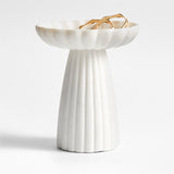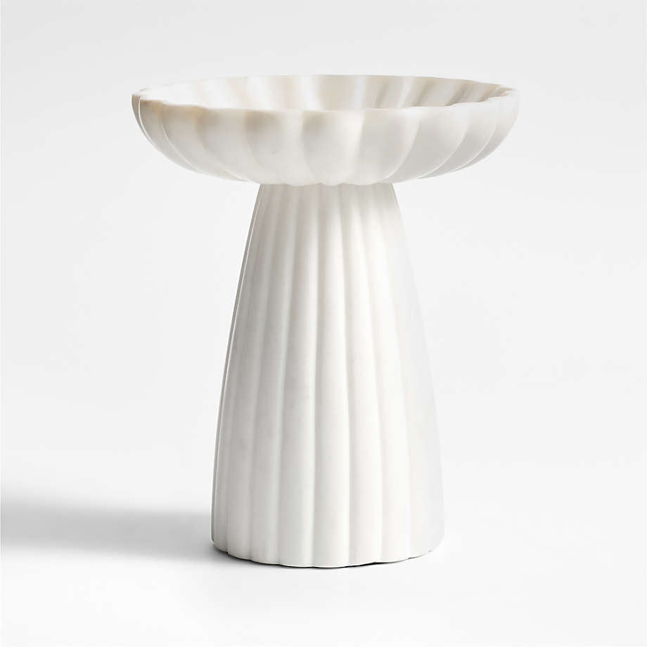 Nuestra colección Jolie ha sido diseñada con un aspecto clásico y una versatilidad moderna. Tallado y pulido a mano, el pedestal de mármol blanco recuerda la estética de una columna dórica. Nos encanta especialmente cómo el cuenco ondulado y la base acanalada dan vida a la piedra natural con suaves sombras y reflejos. El pedestal alto y estrecho realza cualquier objeto, desde fruta fresca hasta brazaletes o velas cilíndricas. Las fascinantes variaciones del mármol hacen que cada pieza sea única.