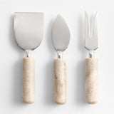 Los mangos de mármol pulido a mano se alían con las hojas de acero inoxidable en este atractivo juego de cuchillos para queso. Diseñado con mangos redondos que muestran los abigarrados tonos beige del mármol y su veteado único, el juego de tres piezas presenta una herramienta diferente para cada tipo de queso. Utilice el utensilio bifurcado para el parmesano y otros quesos duros, el cuchillo redondeado para el brie y otros quesos blandos y la hoja ancha para todo lo demás.
