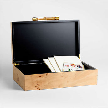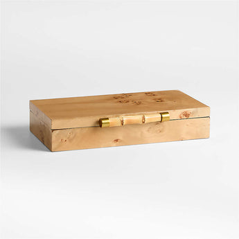 Nuestra colección de almacenaje Volos acorrala sus objetos imprescindibles varios, reduciendo el desorden y mostrando al mismo tiempo los preciados verticilos de la madera burlada. Acabada a mano con un brillo intenso, esta caja con tapa está adornada con un asa de bambú y herrajes de brass reluciente. Recomendamos utilizar la pequeña caja Volos para guardar y proteger accesorios en una cómoda, llaves en una consola de entrada o mandos a distancia en una mesa de centro.