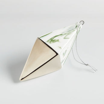 El esmaltado a mano confiere a este adorno de porcelana el aspecto de moda de la mezcla de materiales. El verde y el blanco se arremolinan en la mitad superior del ornamento geofacetado, sugiriendo mármol veteado, mientras que la mitad inferior brilla con un acabado plateado.