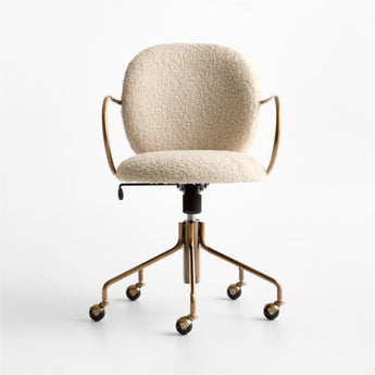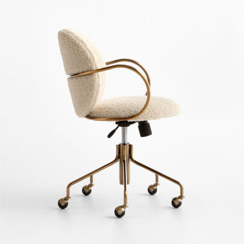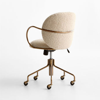 Donde la comodidad de la oficina en casa se encuentra con la inspiración celestial. Nuestra silla de oficina Luna atrae con sus formas redondeadas y el abrazo afelpado de su suave tapizado. El respaldo ovalado contorneado y el asiento acolchado proporcionan una sentada cómoda, mientras que el armazón tubular enlaza los reposabrazos que envuelven el respaldo. Un acabado brass bruñido en the frame y la base de ruedas proporciona un cálido complemento a la tapicería marfil.