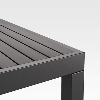 Nuestra colección de muebles Alfresco Exterior emula el aspecto de la madera real con líneas limpias y durabilidad a cualquier clima. Acabada en un elegante color negro, la mesa de comedor rectangular cuenta con listones de imitación de madera dentro de un marco de aluminio resistente y ligero para sentar hasta ocho personas. Combínela con nuestro banco y sillas de comedor Alfresco para mejorar al instante su espacio vital Exterior .