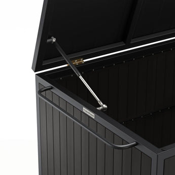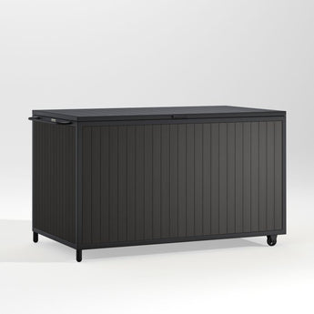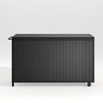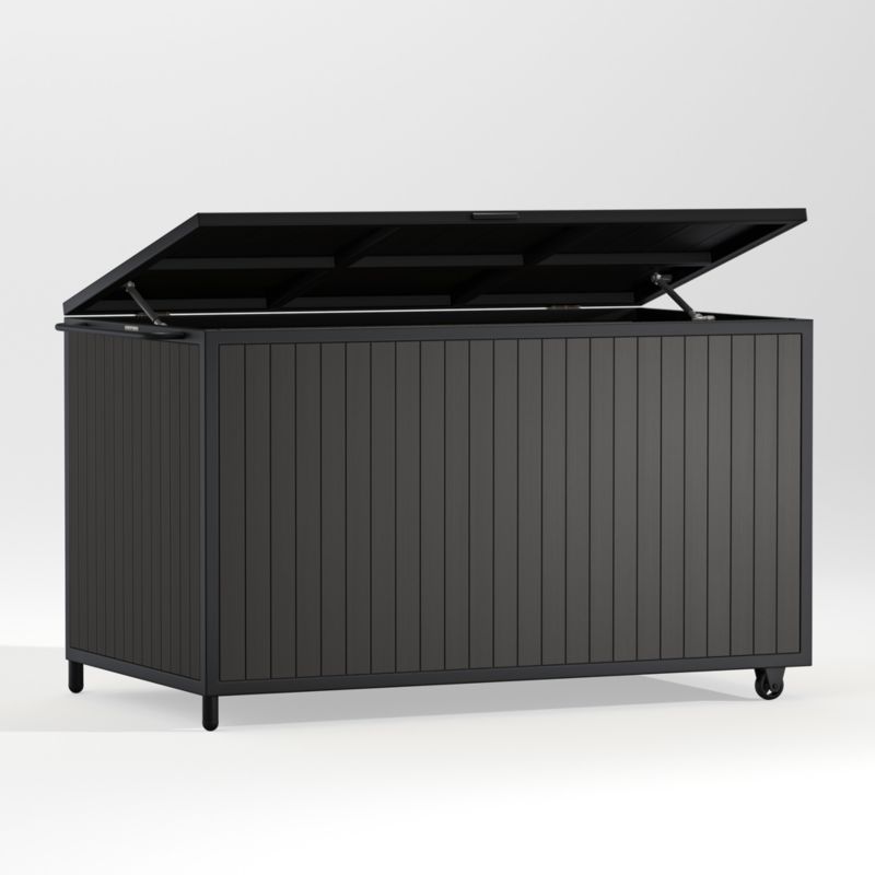 Nuestra colección de muebles de Exterior Alfresco emula el aspecto de la madera auténtica con líneas limpias y durabilidad a toda prueba. Acabada en un elegante color negro, la caja de almacenaje dispone listones de imitación de madera dentro de un robusto pero ligero armazón de aluminio. La parte superior se eleva para ofrecer un amplio espacio de almacenamiento para guardar cojines, almohadas, mantas u otros objetos. Dos ruedas permiten desplazar la caja como estación de servicio o barra adicional.