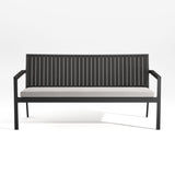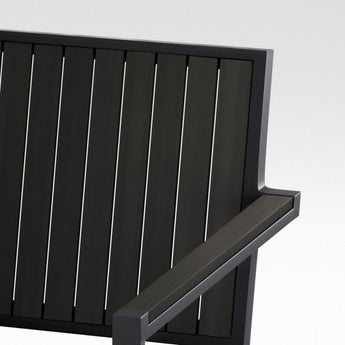Alfresco tiene un aspecto contemporáneo que siempre resulta fresco. Bien fabricado con materiales impermeables, está diseñado para dar la bienvenida al descanso en climas cálidos temporada tras temporada. El armazón de aluminio inoxidable del sofá, con listones de imitación de madera que emulan el aspecto de la madera auténtica, está acabado en un duradero revestimiento en polvo negro. El cojín del asiento de la banqueta está recubierto de tela Sunbrella, un material de inigualables prestaciones Exterior disponible en los colores que elija.