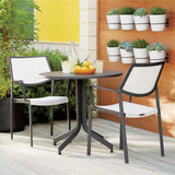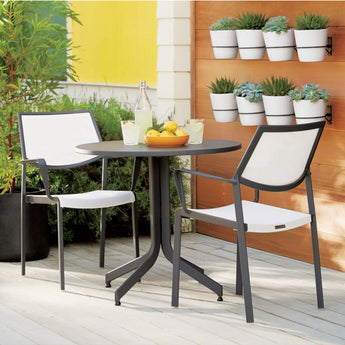 Nuestra elegante y asequible colección Lanai Exterior para el juego de café de moda es perfecta para terrazas pequeñas y balcones urbanos. Diseñada en aluminio con recubrimiento de polvo de charcoal , esta elegante mesa de comedor Exterior a prueba de óxido es ligera y tan duradera que está certificada para uso comercial. ^ La mesa tiene una sólida tapa redonda que se gira verticalmente para guardarla. La mesa de comedor Exterior redonda abatible Charcoal de 32" es una exclusiva de Crate and Barrel .
