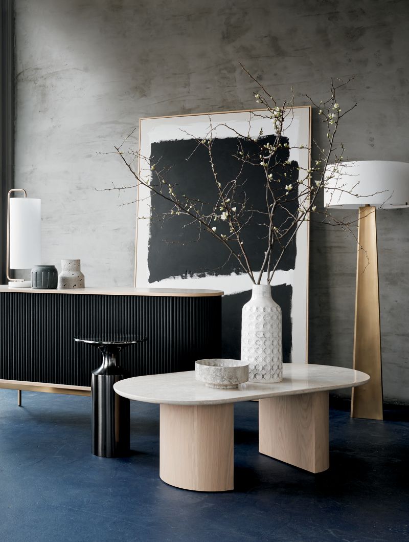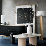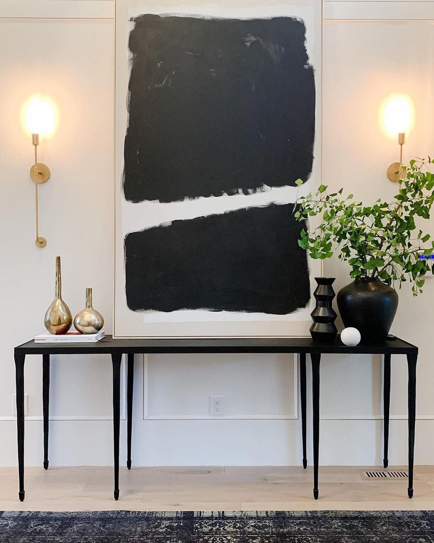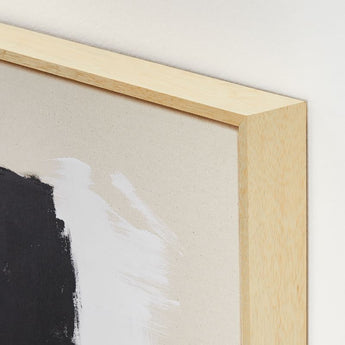 Gráfica, impactante y absolutamente única. Esta obra de arte abstracta explora el espacio positivo y negativo con formas negras pintadas con audacia sobre un campo blanco. Cada obra de arte está pintada a mano sobre lienzo crudo y enmarcada en un flotador contemporáneo de madera rubia. De gran escala y dramatismo, el cuadro luce increíble expuesto en una pared prominente o en el hueco de una escalera. Debido a su naturaleza artesanal, cada cuadro es único y mostrará ligeras variaciones.
