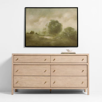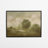 Al crear este paisaje, Hannah Winters se imaginó abriéndose paso entre la densa maleza y la sensación de calma que sentiría al divisar este apacible río en el claro. El colorido sutil y las pinceladas suavizadas confieren a esta obra su cualidad onírica y la atmósfera brumosa que parece fundir las nubes con el suelo. Nuestra impresión giclée capta todos los matices del óleo original y se presenta en un marco de pino envejecido acabado en negro.