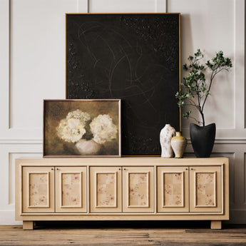 Enamorada de un regalo de flores de hortensia, la artista Jess Engle pasó días esbozándolas para captar su belleza y sencillez. Esta versión pictórica utiliza pinceladas plumosas y una paleta de ensueño para conferir ambiente y misterio al bodegón. Nuestro cuadro giclee capta todos los matices de la obra de arte original, enmarcado en un precioso marco de walnut veteado. Nos encanta sobre una consola de entrada o encima de la cómoda de un dormitorio.