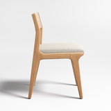 Diseñada para coordinar con nuestra mesa de comedor Lakin, esta silla auxiliar es un verdadero clásico que puede sentarse con cualquier mesa de nuestra colección. El roble blanco macizo protagoniza la grácil mezcla de curvas y líneas que se aprecia en las patas cónicas, el respaldo en ángulo y la postura inclinada. El cojín insertado está tapizado en un tejido jaspeado similar al lino en color avena como moderno complemento a los tonos rubios the frame. La silla de comedor de madera de roble Lakin es una exclusiva de Crate & Barrel.