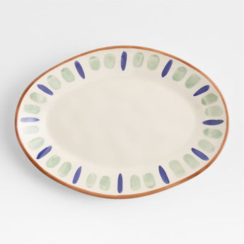 Nuestra vajilla Exterior Taormina emula el aspecto desenfadado y la sensación de brisa de la cerámica mediterránea hecha a mano. Fabricada en melamina ligera y duradera, la fuente ovalada de forma orgánica parece formada a partir de terracota, esmaltada en blanco brillante y pintada a mano con manchas y toques de aguamarina y azul marino en un motivo inspirado en los azulejos tradicionales.