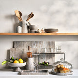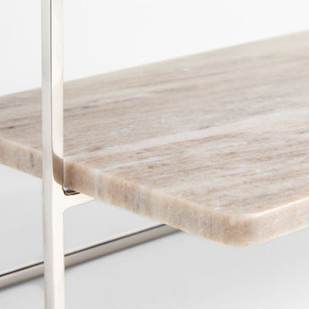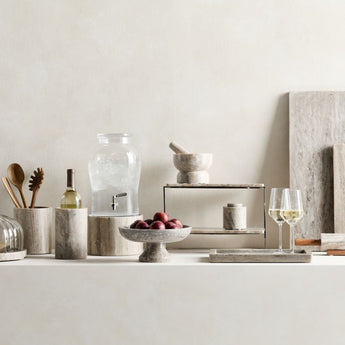 Nuestra colección de cocina Toscana trae a casa la calidez rústica y la belleza orgánica del centro de Italia. Suavemente neutro pero impactante, las losas redondeadas de lujoso mármol beige dan forma a un impresionante servidor de dos niveles con un acabado semimate que mantiene el aspecto atemporal. El soporte acabado en níquel enmarca la piedra natural con líneas limpias para un contraste elegante. El servidor eleva los aperitivos o los postres, infundiendo un toque de dramatismo a las reuniones informales y a las elegantes horas del cóctel. Las sutiles variaciones de tonalidad, veteado y textura hacen que cada servidor de mármol acabado a mano tenga una belleza única.