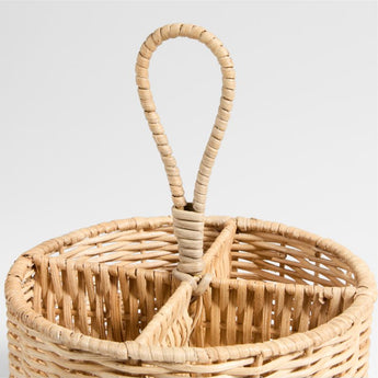 Tejida a mano con ratán duradero al natural, esta cesta redonda de cuatro secciones mantiene los cubiertos, servilletas o condimentos ordenados y de fácil acceso. El asa de transporte en bucle se eleva desde el centro para llevarla fácilmente de un lado a otro.