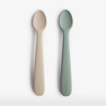 Tanto si los bebés aún necesitan que les den de comer como si ya se alimentan solos (con mayor o menor precisión), estas cucharas para bebés son los utensilios ideales. La suave silicona protege las encías sensibles y los dientes recién salidos mientras los pequeños exploran el amplio mundo de la comida. En tonos cremosos y apagados de verde y beige, el juego de dos cucharas de silicona para bebés coordina con los platos y cuencos de succión Mushie (se venden por separado).