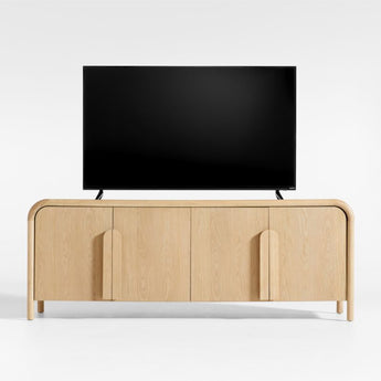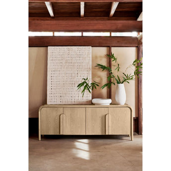 La consola tradicional da un giro contemporáneo en Annie. Esbeltos postes de madera curvada redondean los limpios arcos de las esquinas para resaltar el roble blanco que lucen las puertas de frente plano. El rico veteado se realza con un acabado natural. Limpiamente integrados en el diseño arqueado, los largos tiradores redondeados se abren para revelar dos estantes ajustables para guardar mantelerÃa, equipos de audio o vajilla de comedor. Combinando a la perfección con nuestro exclusivo armario Annie, la consola multimedia Annie refresca el almacenamiento doméstico con un aspecto actual y de líneas limpias.