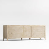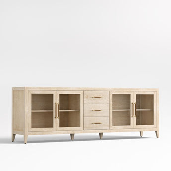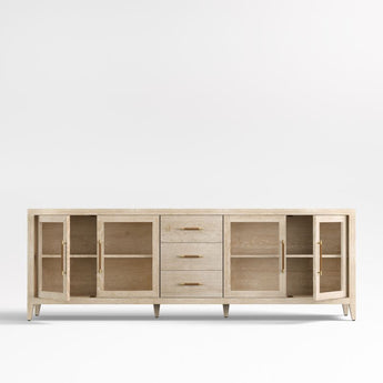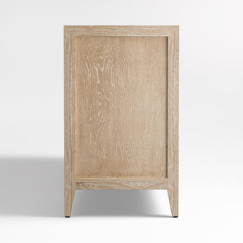 Hemos trasladado la refinada elegancia de nuestras populares mesas de acento Clairemont a una colección de almacenaje fabricada en roble con un bonito veteado. Apoyada sobre patas cónicas, la consola multimedia de líneas limpias presenta esquinas a inglete y paneles empotrados en la parte superior y los laterales. Los armarios Cristal, cada uno con un estante ajustable, flanquean una pila de tres cajones. Los tiradores Brass con envoltura de cuero envejecido proporcionan acceso junto con una nota de gracia de materiales mixtos. Un acabado en madera de deriva clara con cerusa marfil resalta el bello veteado catedral de la madera.