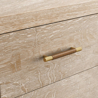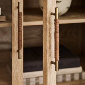 - Tiradores de acero con acabado de brass y envoltura de cuero