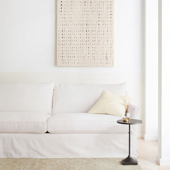 Nuestra obra de fibra Daisy Chain diseñada por Leanne Ford adorna la pared con colores neutros y textura orgánica. Humildes hilos de algodón se agrupan en bandas para dar forma a un dinámico tejido de cesta de matizados tonos crema y agradable asimetría. Envuelta en un ligero marco de aluminio, esta pieza de arte mural de fácil decoración se cuelga vertical u horizontalmente. Nos encanta su color claro y su atractivo natural, especialmente cuando se expone en una habitación salpicada de nuestros jarrones y cestas artesanales.
