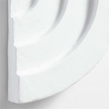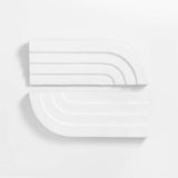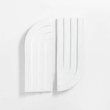 Una mezcla de papel reciclado, polvo de tiza y arcilla esculpe nuestro conjunto de arte mural en blanco brillante. Cada medio arco del conjunto de dos piezas está moldeado con un patrón de pasos concéntricos, lo que confiere al conjunto de arte mural un aire gráfico de los años 70 templado en blanco. Una forma cuelga con el lado curvado hacia arriba y la otra con el lado curvado hacia abajo, lo que añade dinamismo al conjunto.