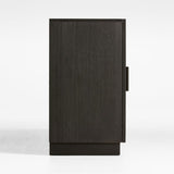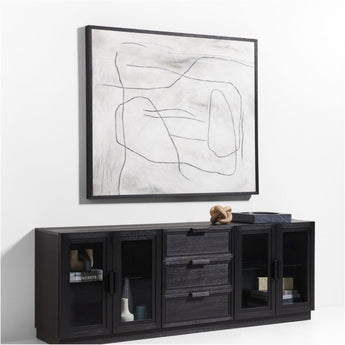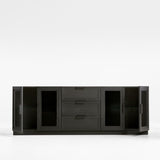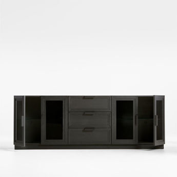 Calypso abre el almacenamiento de la sala de estar con un aspecto ligero y aireado. Compuesta por tres cajones apilados flanqueados por dos armarios, la gran consola multimedia arroja luz sobre lo que se muestre con puertas y estantes Cristal . La madera de olmo enmarca la consola con molduras escalonadas, fuertemente cepilladas y con un acabado negro para resaltar las vetas. Las bases de zócalo empotradas y los tiradores en forma de bloque añaden detalles modernos a esta intemporal consola multimedia con armarios, una exclusiva de Crate & Barrel.