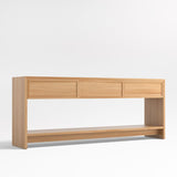 Calypso abre el almacenamiento del salón o el comedor con un aspecto ligero y aireado. Compuesta por tres cajones y un amplio estante abierto, la gran consola ofrece espacio cerrado de almacenamiento y exposición. Los detalles escalonados y los tiradores horizontales añaden notas de diseño lineal, mientras que el cepillado de alambre y el acabado natural resaltan las bellas vetas del olmo.